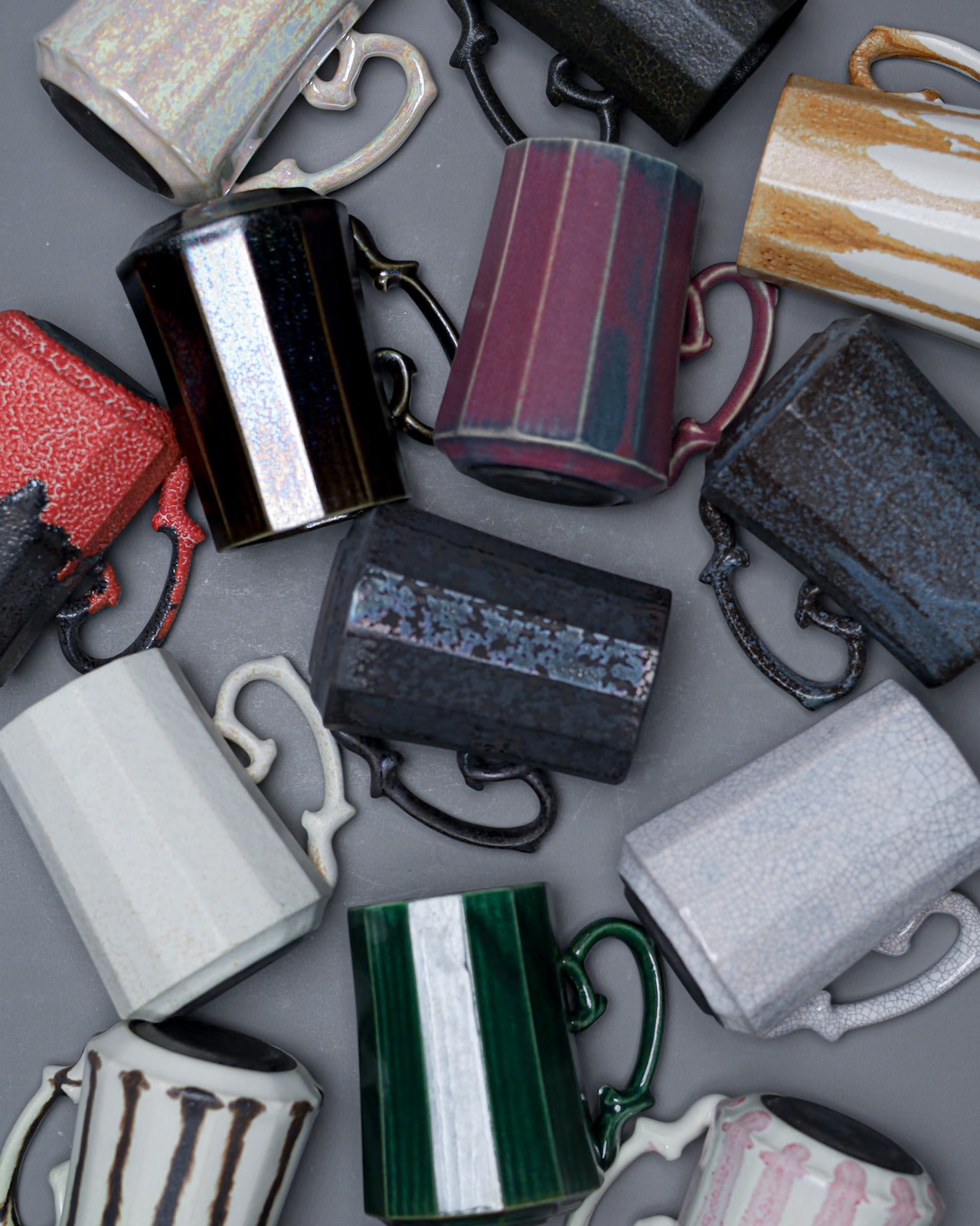 作品はすべて一点ずつ手作業で制作しており、釉薬も結晶や景色の出方に繊細な変化があるものを使用しています。窯入れのタイミングや焼成条件など、さまざまな要因によってサイズや色味、表情、肌質、濃淡に個体差が生じることがございます。