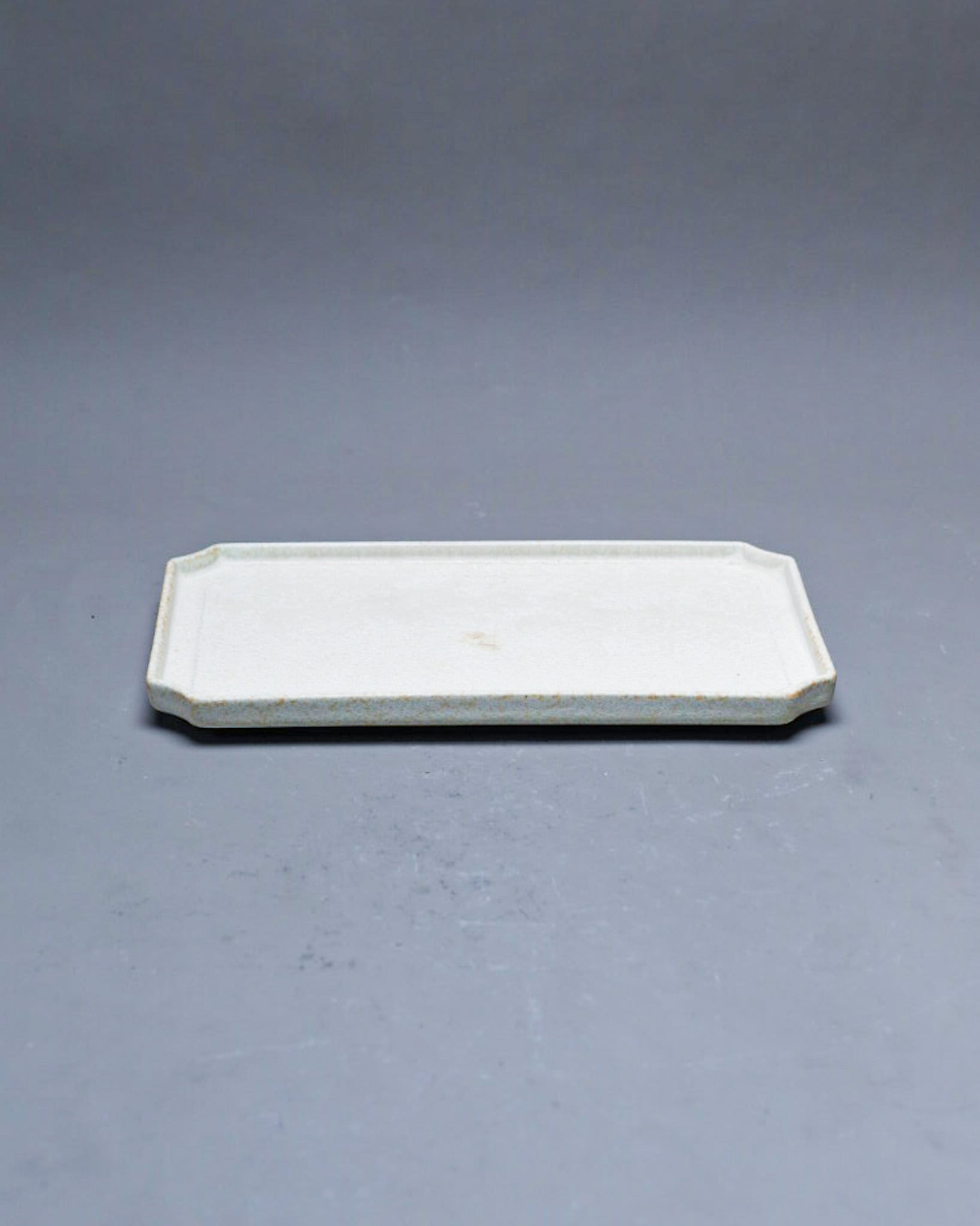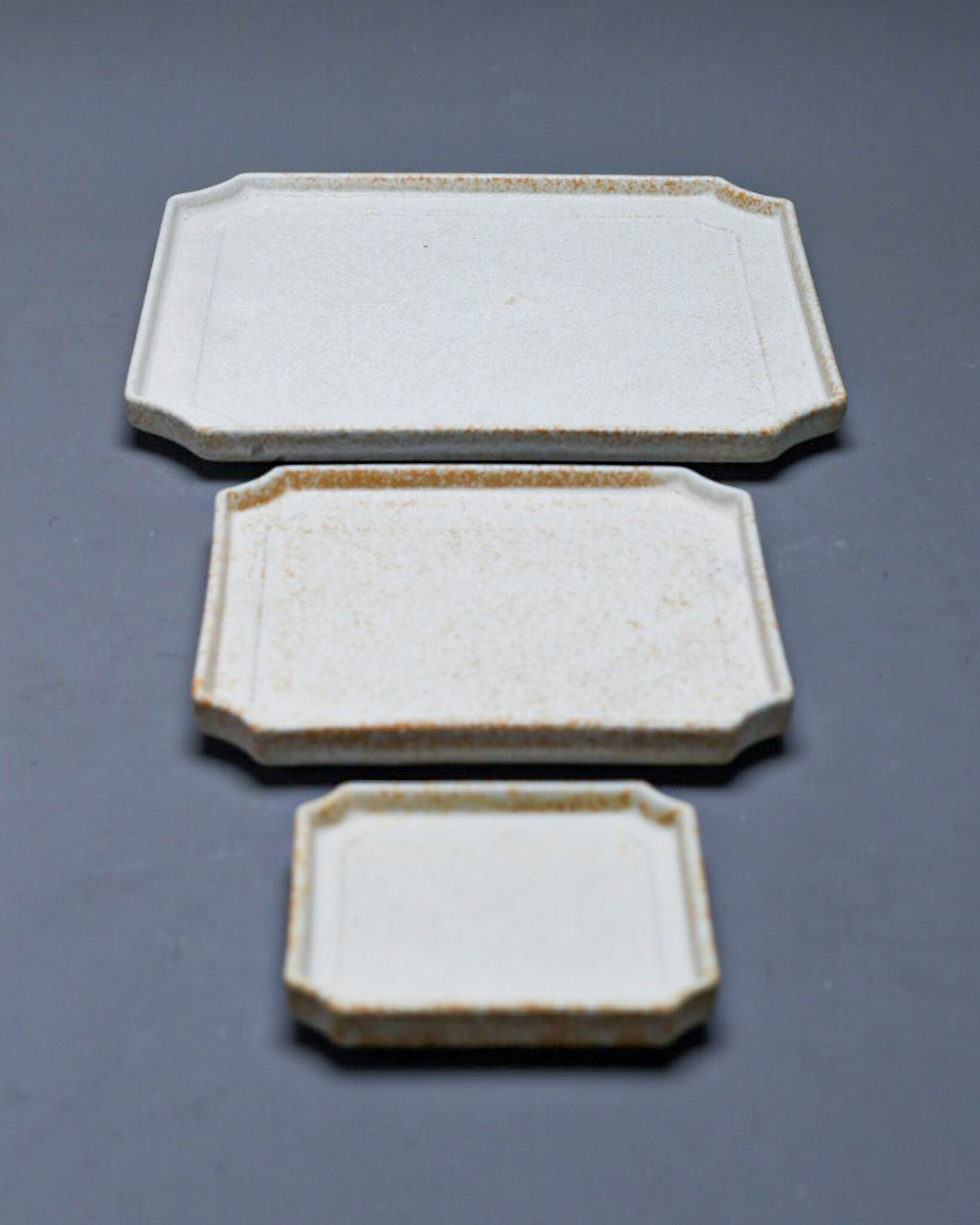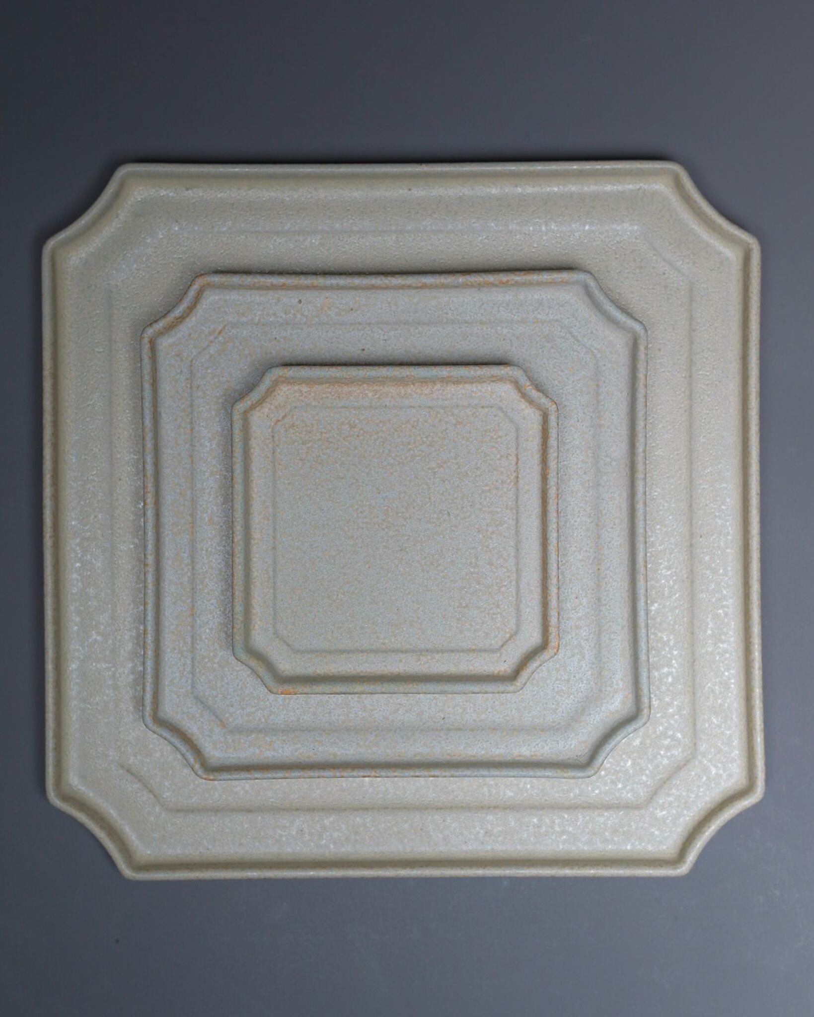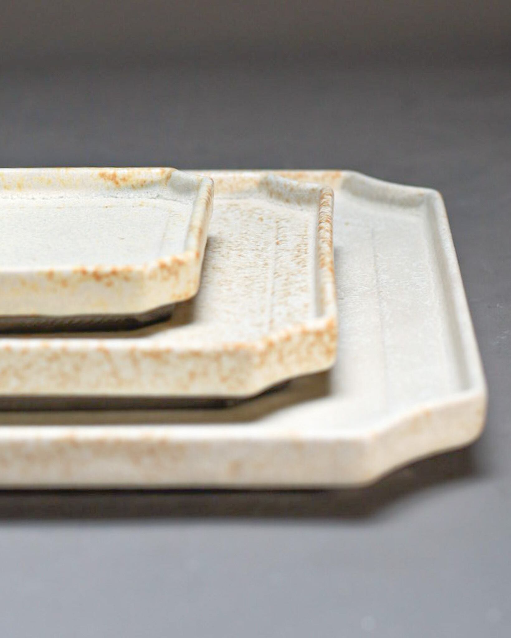 シンプルな四角形にリズムとアクセントを加え、和洋を問わず料理を引き立てる器に仕上げています。