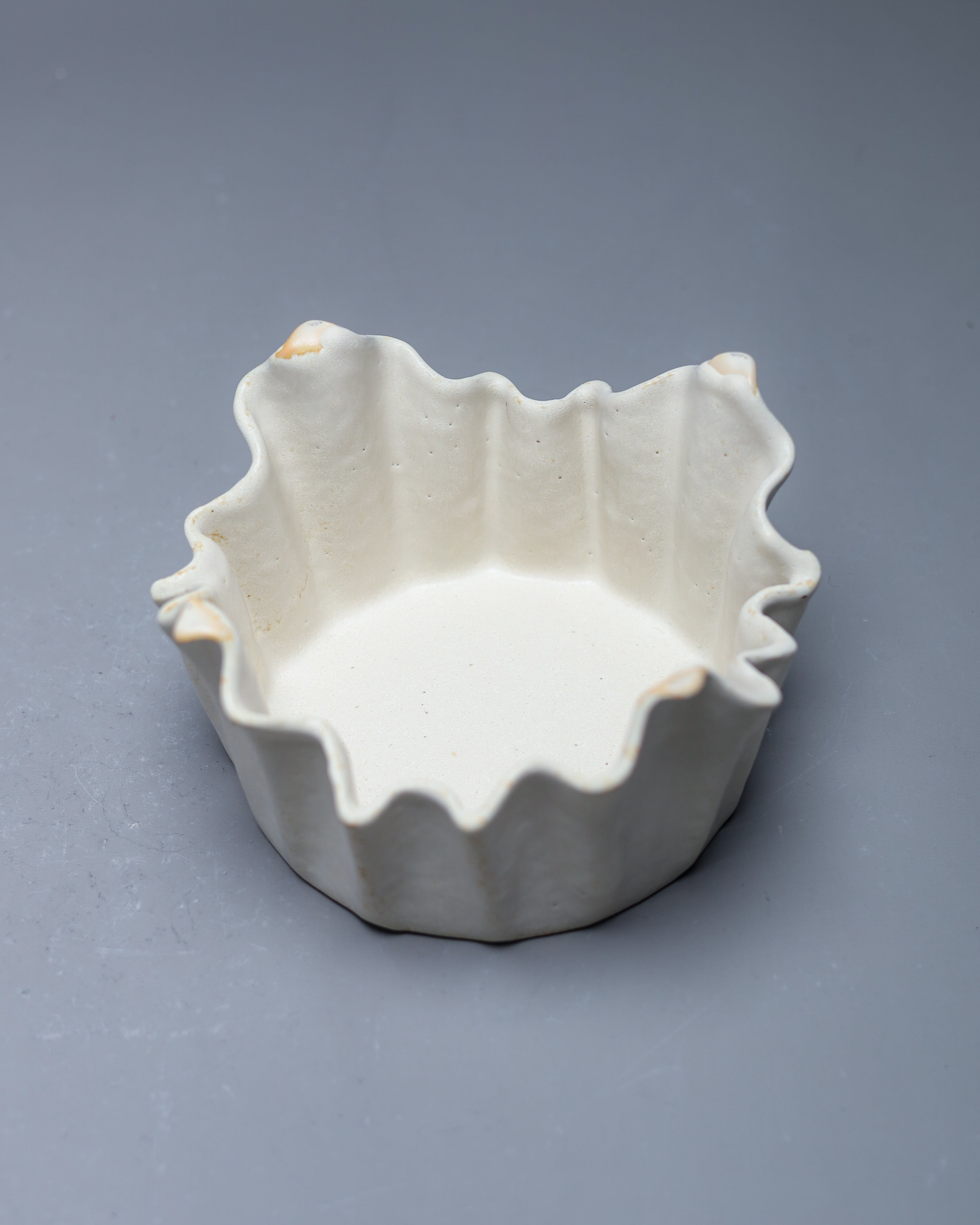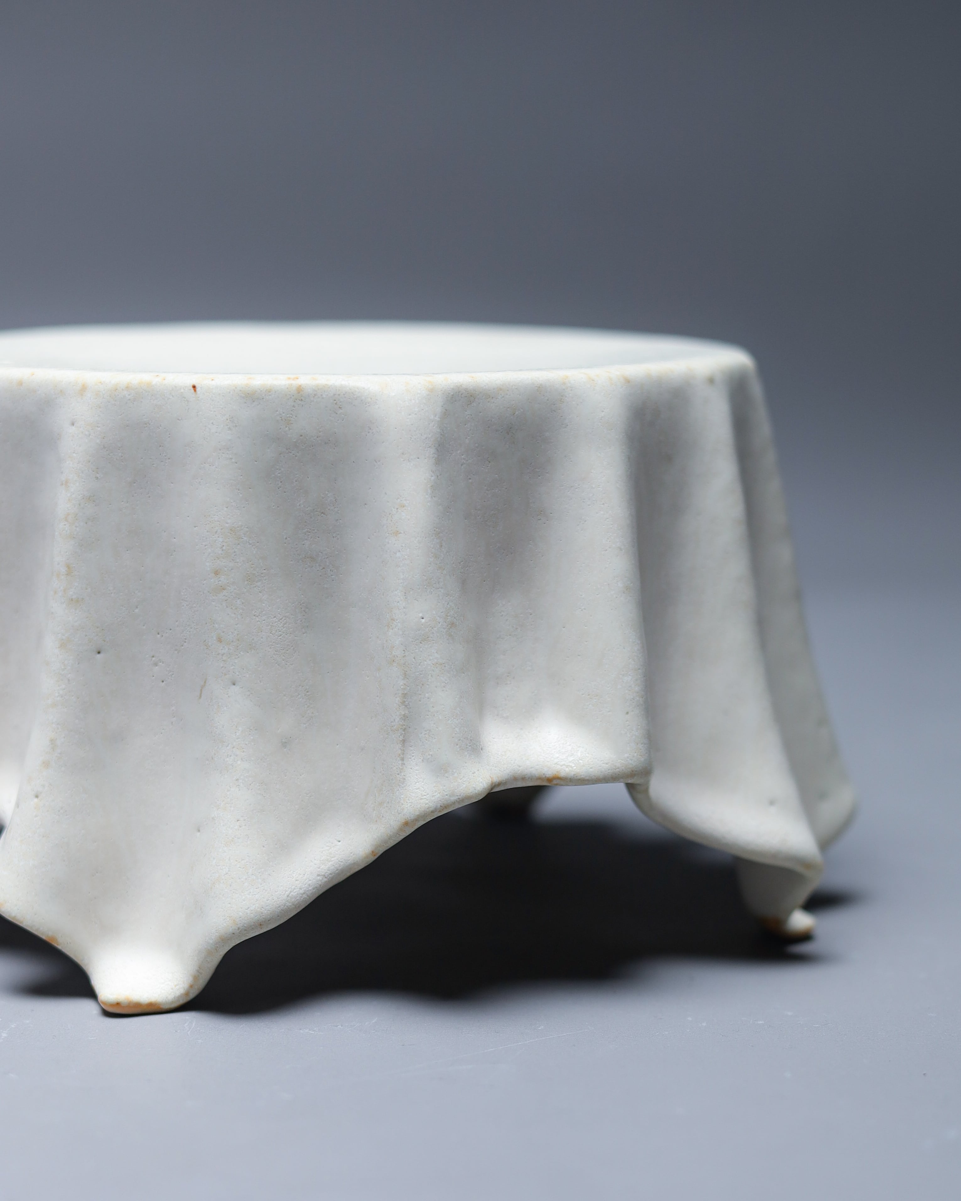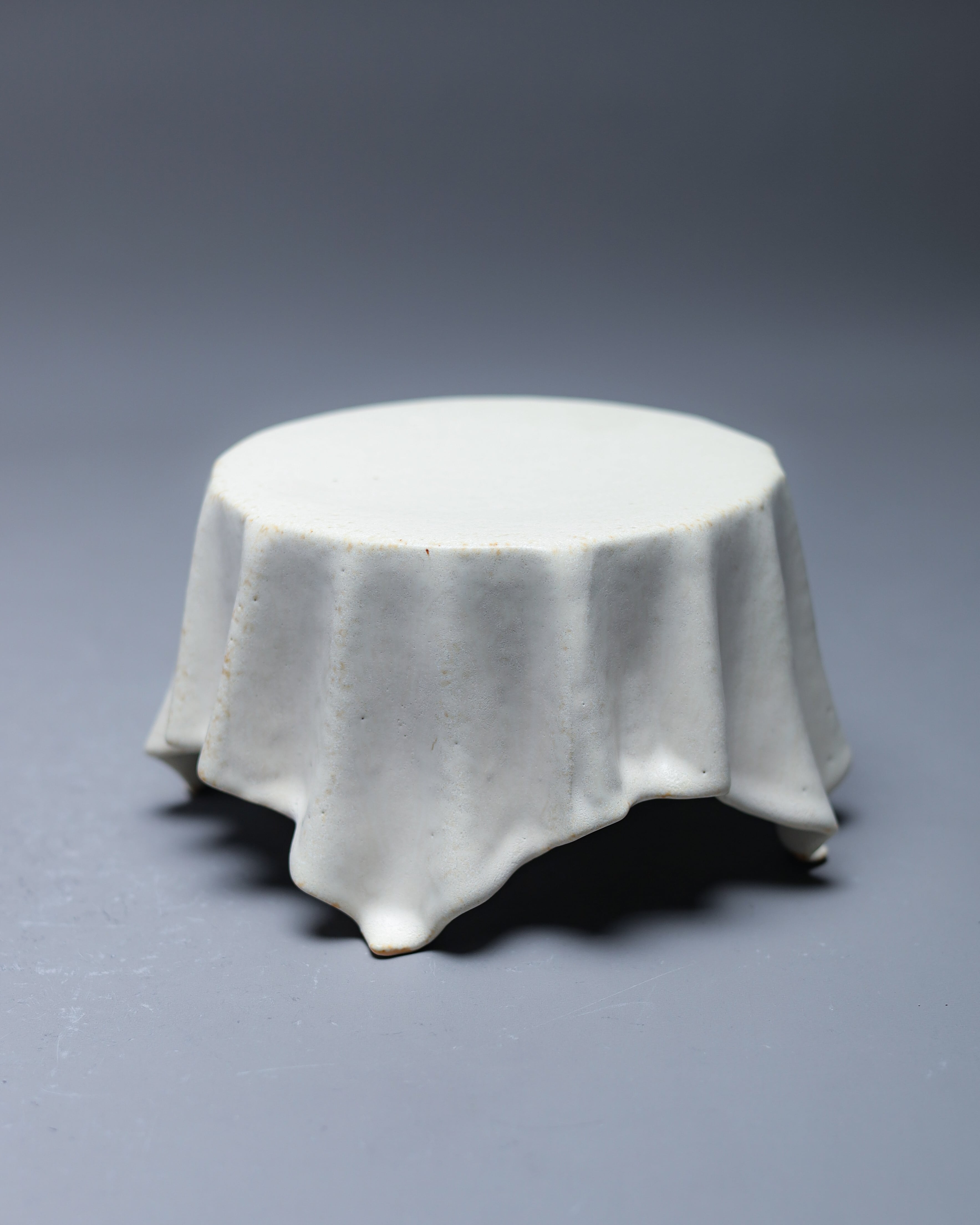 テーブルの上にふわりとかけられたクロスを、そのまま陶器に写しとった作品。布のやわらかなドレープと、陶の凛とした存在感が同居する一皿です。